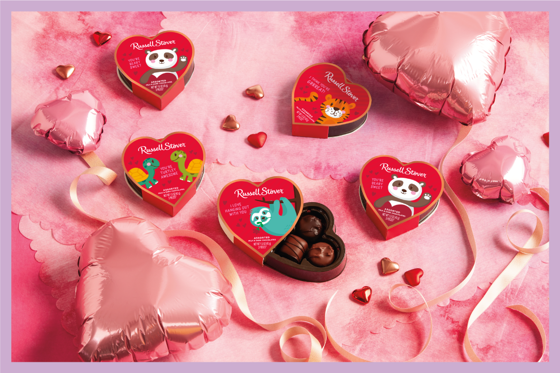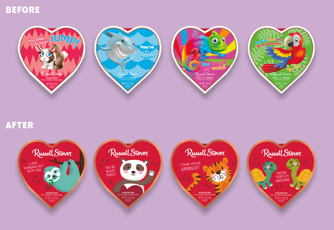 Russell Stover offers a variety of heart boxes filled with assorted chocolate for Valentine’s Day. Below are a few examples of taking classic heart designs and giving them a modern touch with simple updates to color, typography, and illustration style while still maintaining the heart’s integrity and purpose.