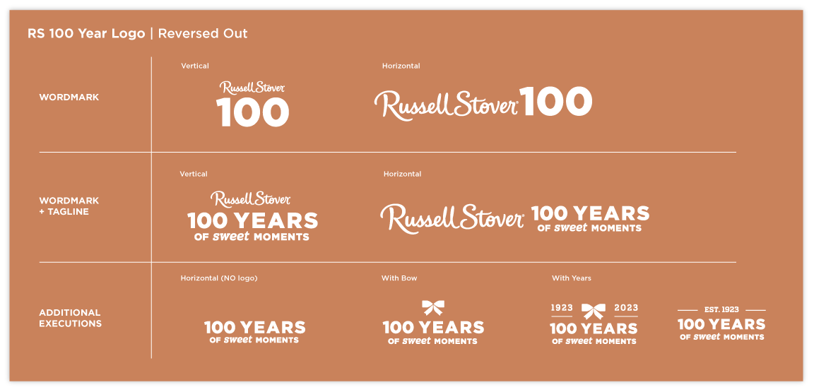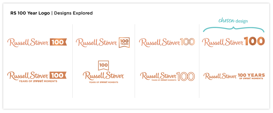Fewer than 1% of companies reach 100 years, and Russell Stover needed a bold milestone logo to celebrate. The design had to pair seamlessly with the RS script wordmark and be versatile enough for multiple iterations while maintaining its identity.
